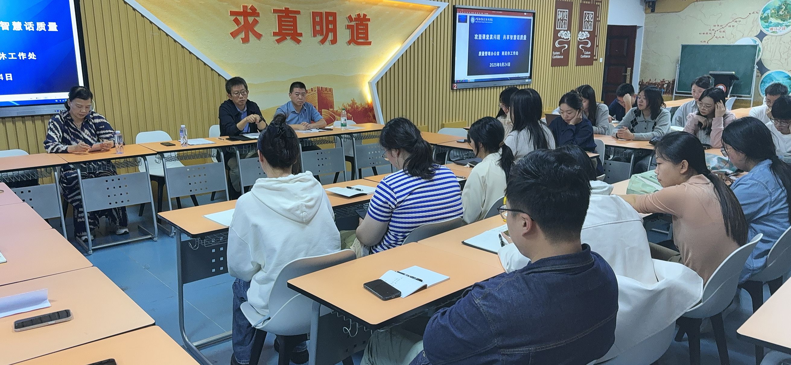 为充分发挥离退休教师智慧,协助新教师树立课堂质量意识,9月24日下午,质量管理办公室联合离退休工作处在文渊楼203教室举办新教师沙龙活动,沙龙主题为“攻坚课堂真问题 共享智慧话质量”。本次活动由质量管理办公室副主任宋锦刚主持,学校退休教师原学术委员会主任委员尹玉珍教授、学校退休教师原学校督导姚妙爱副教授和学校新教师参加。